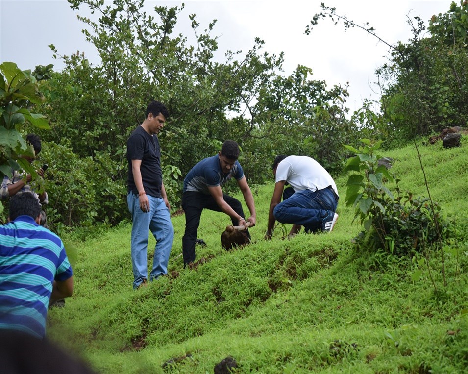 Our team plants about close to 30 saplings. The NGO team, experienced with the planting, painstakingly revisits each sapling to ensure it has been planted right and the soil around it made firm so that it can support a growing tree. They stomp on the soil and harden it around a few saplings where it may have looked loose.